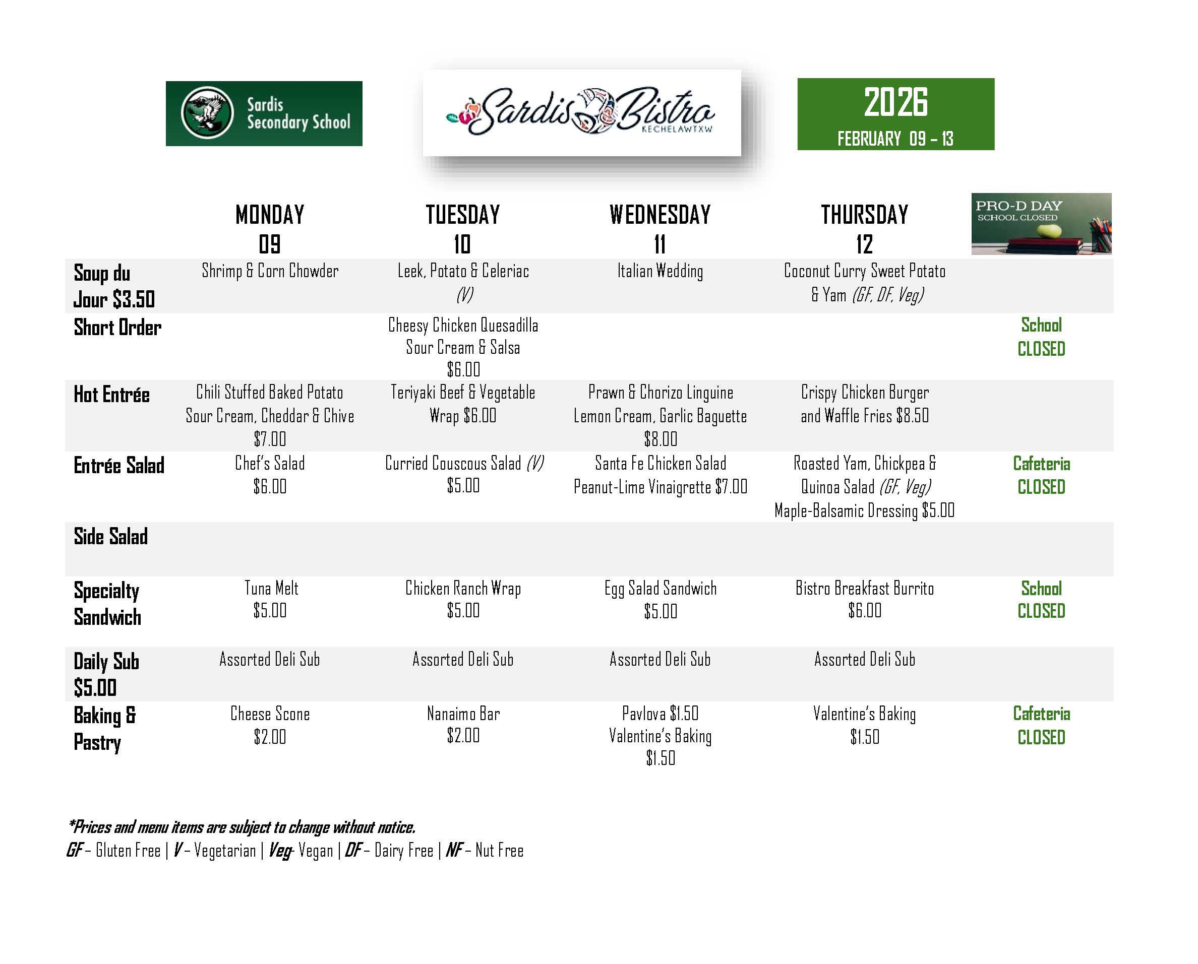 Prices and items are subject to change. Buy your Bistro lunch cards at the office or through StudentQuickpay! File Attachment Sardis Bistro Menu February 09 - 13.pdf98.6 KB