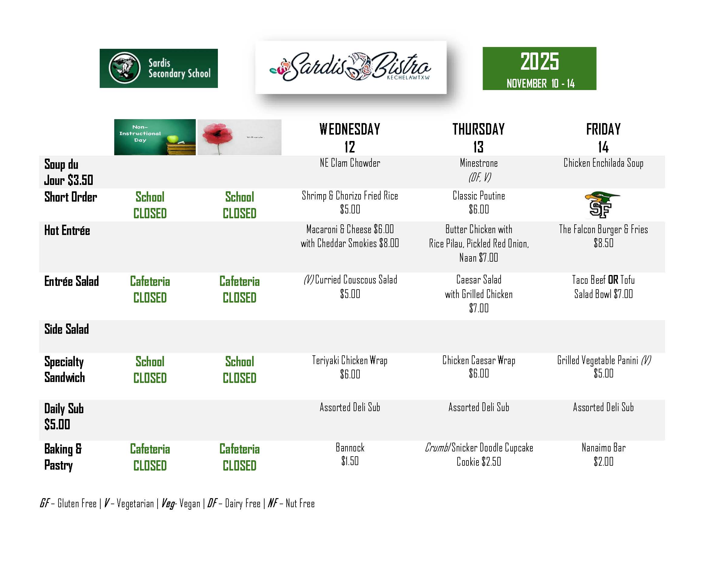 Prices and items are subject to change. Buy your Bistro lunch cards at the office or through StudentQuickpay! File Attachment Sardis Bistro Menu November 10 - 14.pdf105.4 KB